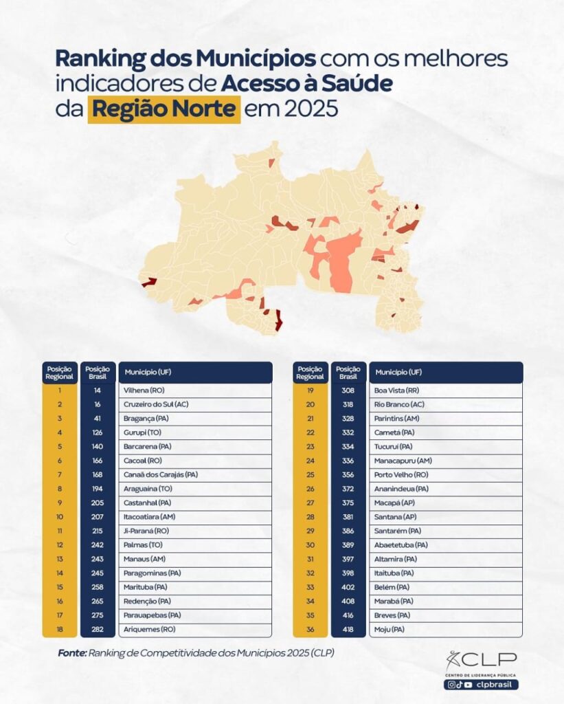 Itacoatiara se consolida como referência em políticas públicas de Saúde na Região Norte. De acordo com o Ranking de Competitividade dos Municípios 2025, divulgado pelo Centro de Liderança Pública (CLP) nesta quarta-feira, 29 de outubro, o município alcançou a 10ª colocação entre os municípios com os melhores indicadores de acesso à Saúde na região, sendo o mais bem avaliado do Estado do Amazonas — à frente, inclusive, da capital Manaus.