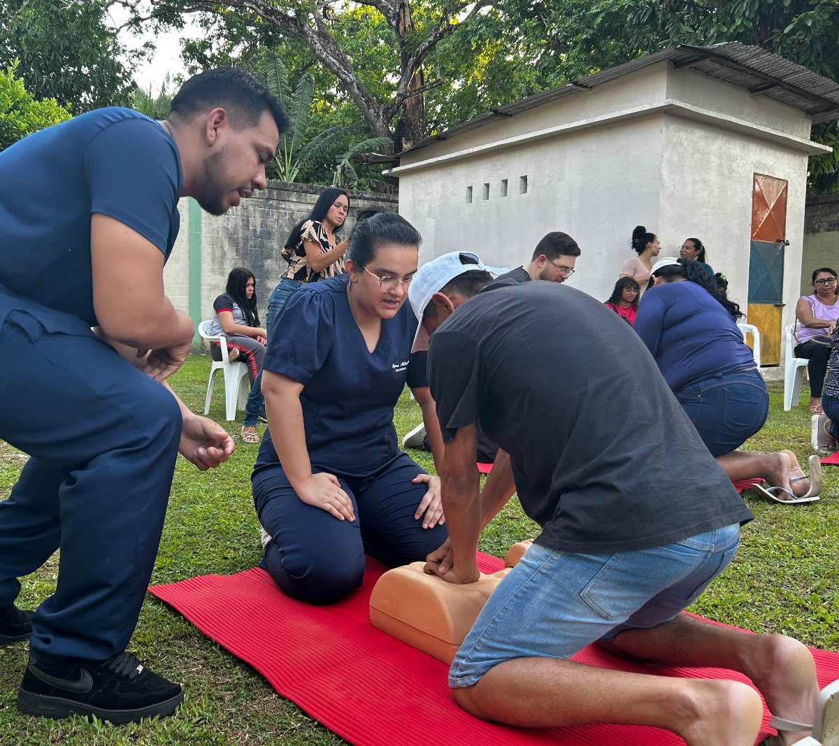 Durante a ação, os acadêmicos de Medicina compartilharam técnicas e orientações práticas sobre situações de emergência. O acadêmico Jhoselito Júnior, do 7º período de Medicina da Faculdade Afya, destacou que a iniciativa faz parte do Projeto Brigada Curumim Cunhantã, que leva conhecimentos de primeiros socorros para a população.